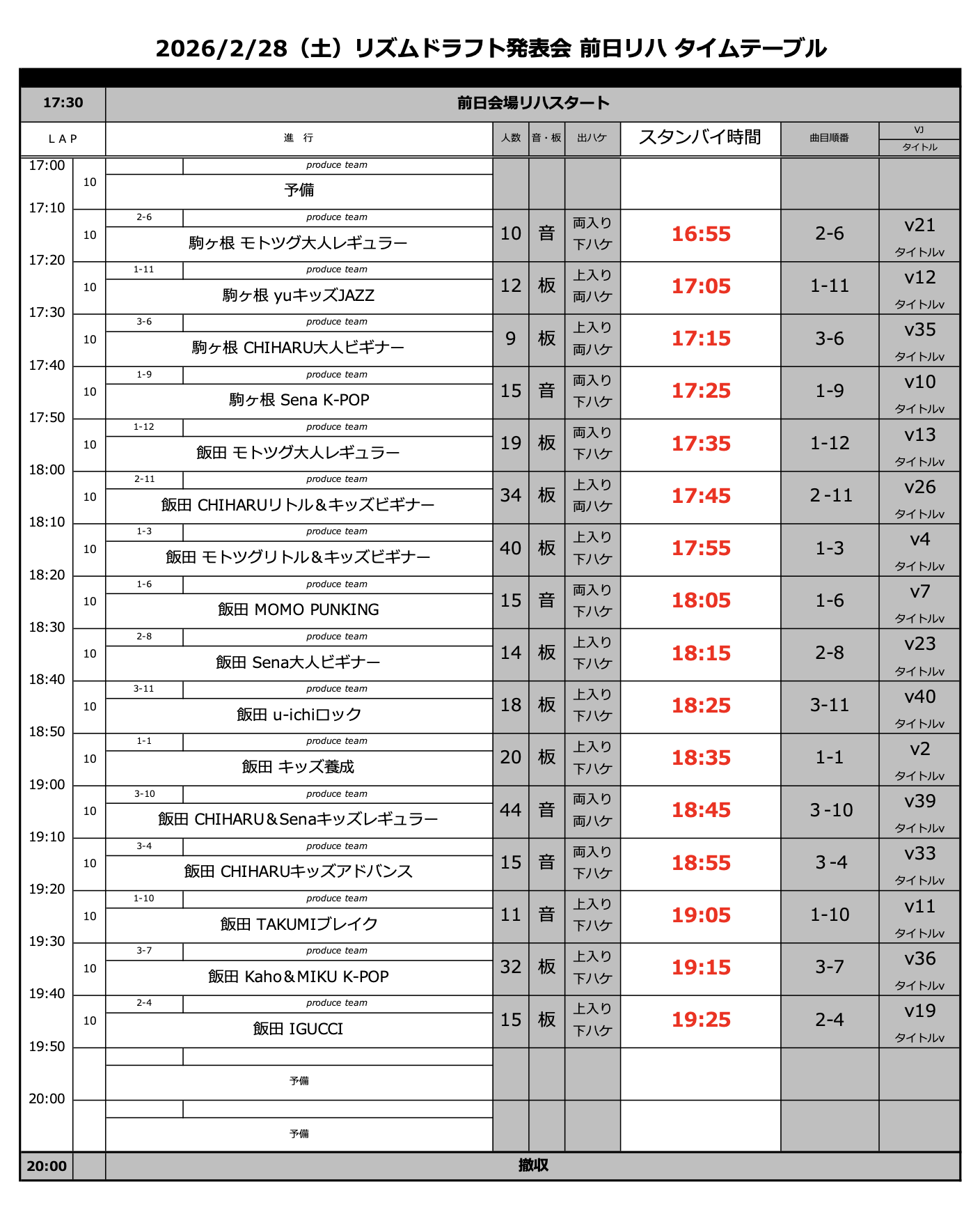 ⚠️当初は飯田&駒ヶ根のナンバーは全て前日にリハを行う予定でしたが、この日は全校通常レッスンが行われている関係もあり、駒ヶ根の複数のナンバーは当日リハへと予定を変更させていただきました。