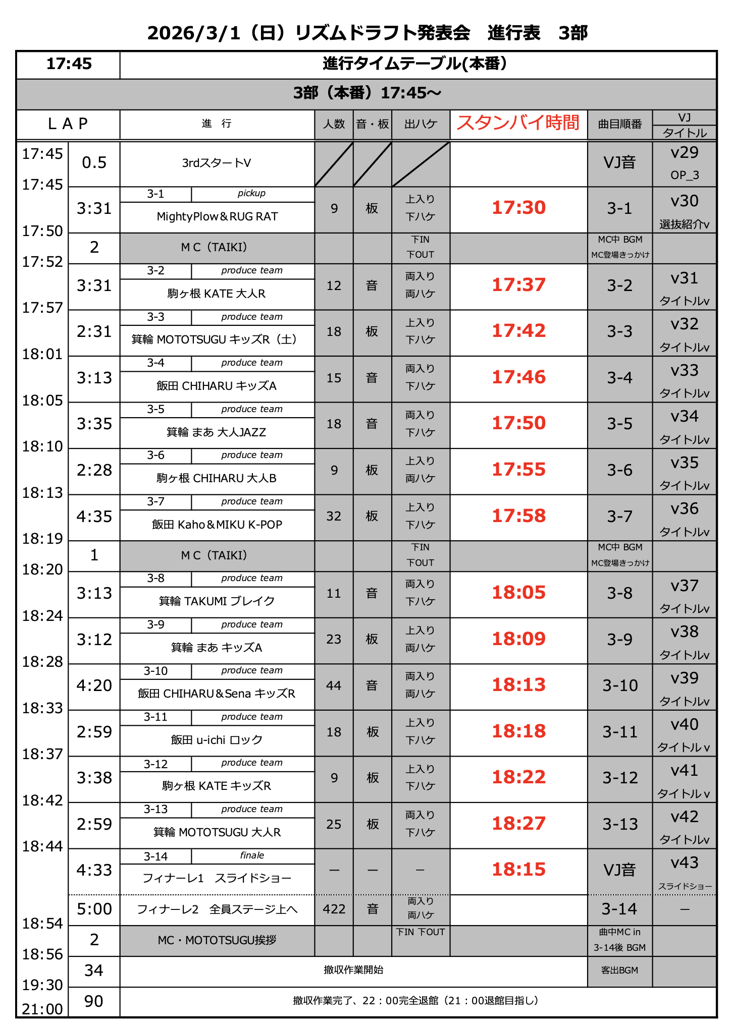 続いて、本番のタイムスケジュールとスタンバイの目安の時間です▼