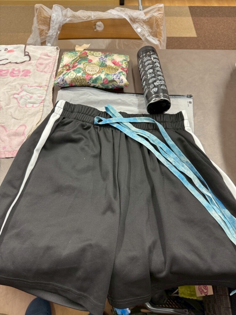 (中央の黒に白ラインのハーパン、水色のリボン、キウイの絵が書いてあるポーチ、スシローの水筒、椅子にかかってる透明なレインコート100cm)