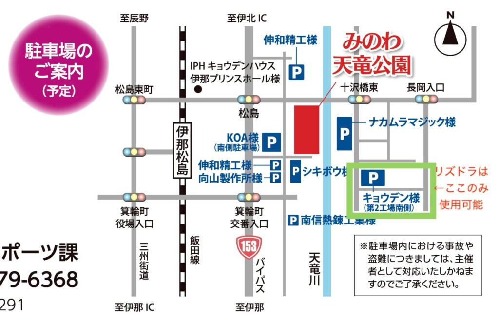キョウデン様の駐車場以外は、全てナイトウォークイベントのウォーキングに参加される方専用の駐車場となりますので、リズドラでは使用できません。ご理解、ご協力のほど宜しくお願い致します。