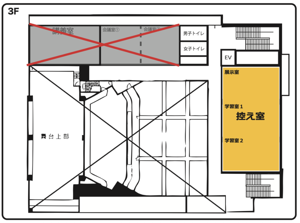 ・控え室(3階 展示室・学習室1・2)はアップ等にお使いください。(下記画像の黄色の部屋)